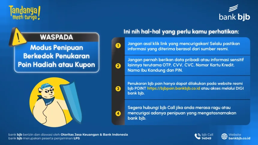 • Penukaran bjb POIN Hanya Melalui Situs Resmi, Pastikan Anda hanya melakukan penukaran melalui: https://bjbpoin.bankbjb.co.id atau melalui aplikasi bjb DIGI .Selain itu, abaikan semua link yang dikirim melalui pesan pribadi.