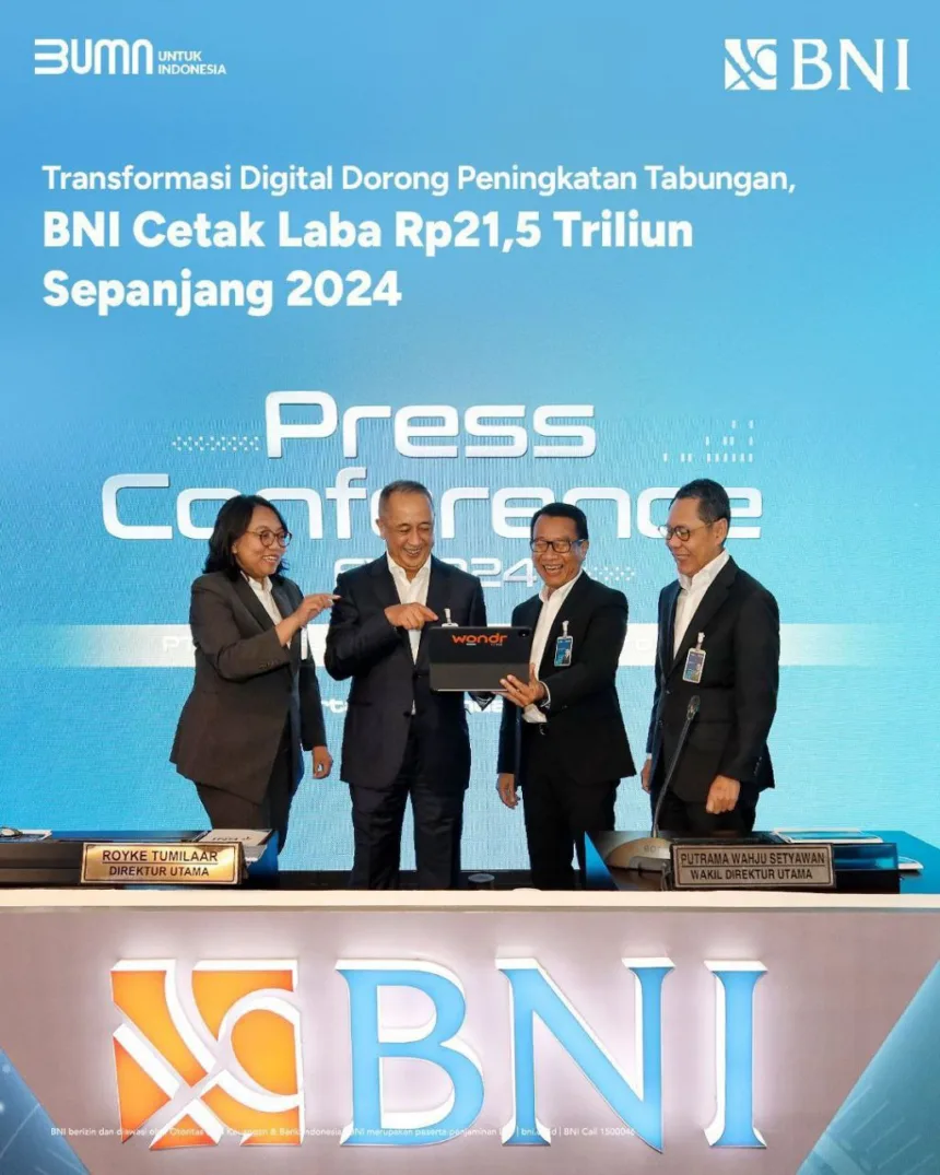 EKBISPAR.COM — BNI berhasil menutup tahun 2024 dengan fundamental yang kuat. Laba bersih BNI naik menjadi Rp21,5 triliun, lebih tinggi dibandingkan perolehan pada tahun sebelumnya sebesar Rp20,9 triliun. Pertumbuhan ini didorong oleh transformasi digital yang berhasil meningkatkan tabungan sebesar 11% secara tahunan (Year-on-Year/YoY), dari Rp232 triliun pada tahun 2023 menjadi Rp258 triliun pada tahun 2024.
