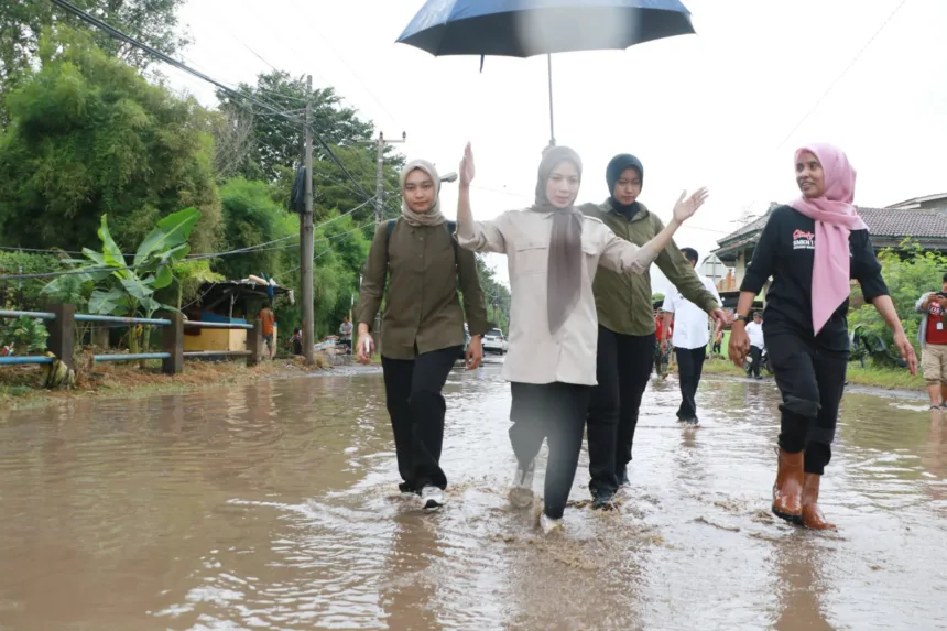 SERANG, EKBISPAR.COM – Bupati Serang Ratu Rachmatuzakiyah meninjau lokasi banjir di Kampung Mekarsari, Desa Margasari, Kecamatan Pulo Ampel, akibat tingginya curah hujan yang terjadi sejak Selasa, 17 Juni malam hingga Rabu, 18 Juni 2025 dini hari. Ratu Zakiyah tidak risih menerjang genangan air dengan ketinggian sekitar 15-20 sentimeter untuk menyapa warga korban banjir satu persatu.