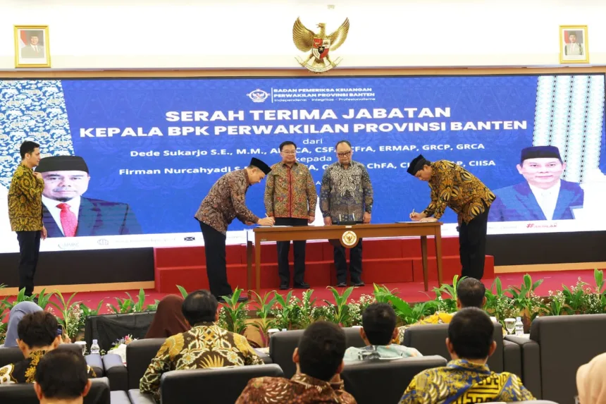 SERANG, EKBISPAR.COM – Gubernur Andra Soni menghadiri serah terima jabatan Kepala Badan Pemeriksa Keuangan (BPK) Perwakilan Provinsi Banten dari Dede Sukarjo kepada Firman Nurcahyadi di Aula BPK Perwakilan Provinsi Banten, Palima, Kota Serang, Jumat 11 April 2025.