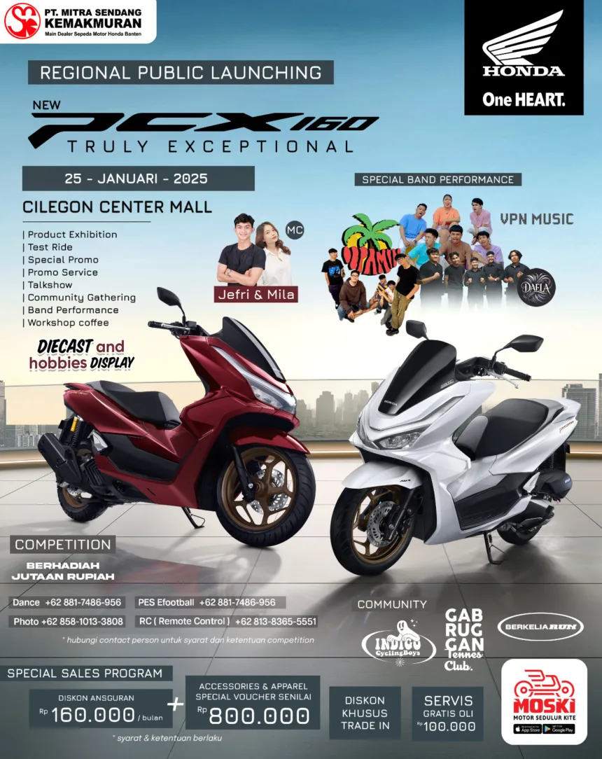 Catat tanggalnya! jangan lewatkan kesempatan untuk menjadi bagian dari momen spesial ini! Mari bergabung di Cilegon Center Mall pada Sabtu, 25 Januari 2025, dan rasakan keseruan acara serta keunggulan New PCX 160 secara langsung.