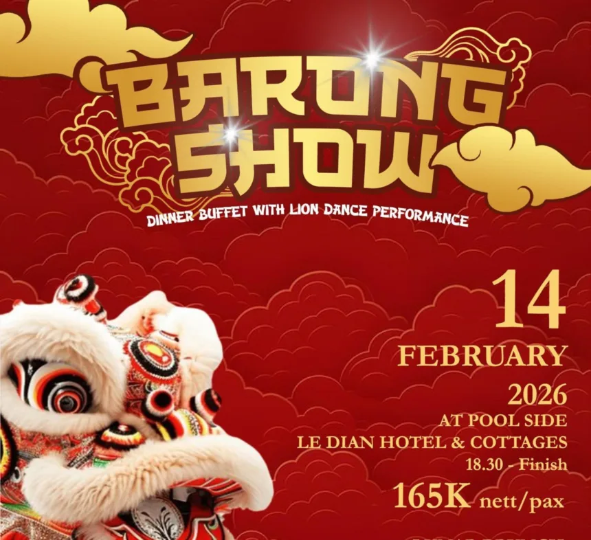 EKBISPAR.COM — Le Dian Hotel & Cottages menghadirkan perayaan Tahun Baru Imlek 2026 melalui gelaran Barong Show, sebuah acara hiburan yang dikemas dengan keseruan dan dapat dinikmati seluruh kalangan. Acara ini akan digelar pada 14 Februari 2026 di area poolside Le Dian Hotel, Kota Serang, dengan konsep dinner buffet yang dipadukan dengan pertunjukan barongsai dan hiburan lainnya.