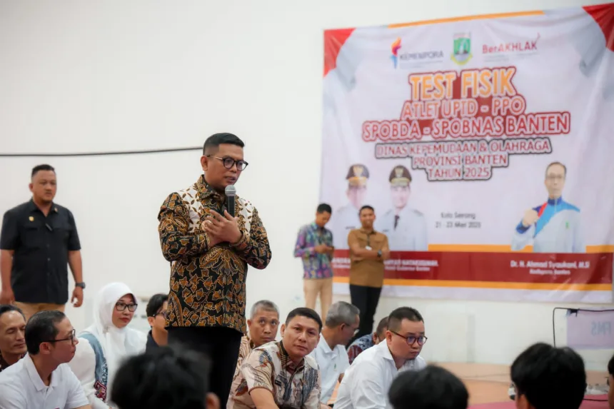 SERANG, EKBISPAR.COM – Gubernur Banten Andra Soni meninjau Pemusatan Latihan Popnas 2025 atlet Provinsi Banten di Pusat Pendidikan dan Latihan Olahraga Pelajar (PPLP) Provinsi Banten di Jl Raya Cilegon No 517, Drangong, Kota Serang, Kamis (22/5/2025). Andra Soni memberikan motivasi berprestasi dan membangun mental juara terhadap para atlet pelajar Provinsi Banten yang akan bersaing di Pekan Olahraga Pelajar Nasional 2025 di Jakarta.