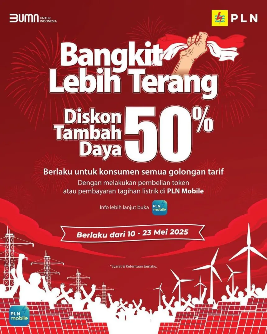 EKBISPAR.COM — PT PLN (Persero) menghadirkan promo nasional bertajuk “Bangkit Lebih Terang”, berupa diskon 50 persen untuk layanan tambah daya listrik bagi pelanggan semua golongan tarif di seluruh Indonesia. Promo ini berlaku mulai tanggal 10 hingga 23 Mei 2025, dan dapat dimanfaatkan oleh pelanggan daya 450 hingga 5.500 VA.