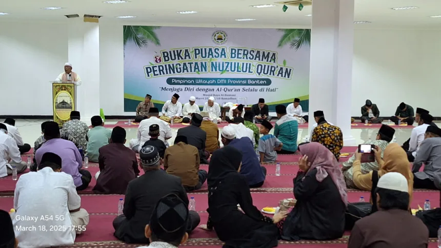 SERANG, EKBISPAR.COM – Pengurus Wilayah Dewan Masjid Indonesia (PW DMI) Provinsi Banten periode 2024-2029 menggelar acara buka bersama sekaligus peringatan Nuzulul Qur’an dengan tema “Menjaga Diri dengan Al- Quran selalu di Hati” di Aula Majid Raya Al Bantani KP3B Curug, Kota Serang, Selasa (18/3/2025). Acara Bukber dan peringatan Nuzulul Qur’an dihadiri seluruh pengurus PW DMI Provinsi Banten.